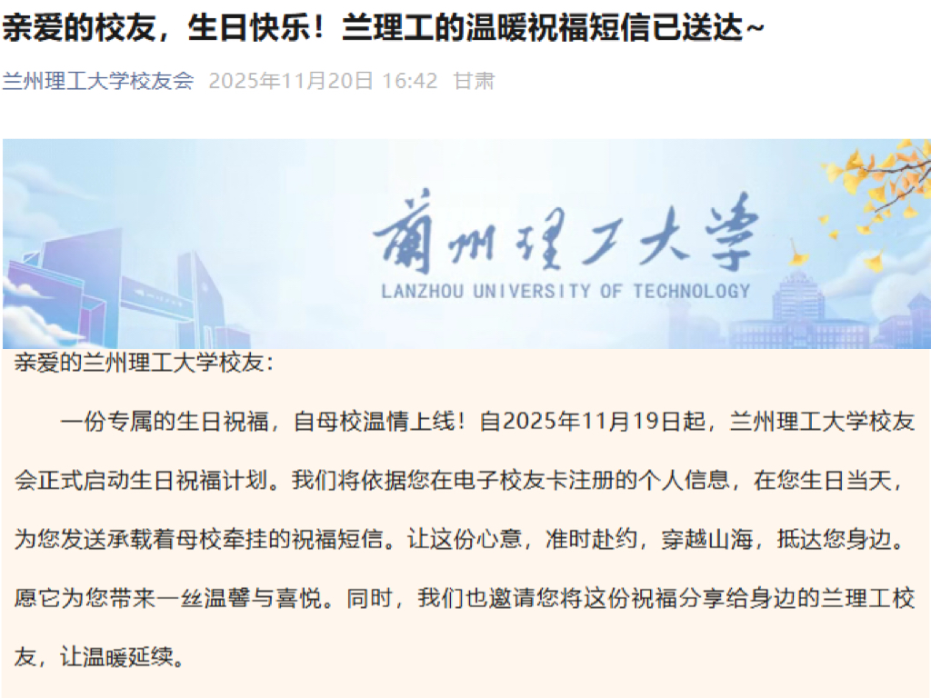 为传承母校对校友的持续关怀,学校特别开发了校友生日祝福系统。每年在校友生日之际,系统将自动通过短信向已认证校友发送生日祝福。此项功能旨在营造温馨的校友文化,让无论身在何方的校友,在生日当天都能感受到来自母校的真诚祝福,将"一日兰理工人,一生兰理情"的美好情谊融入日常。