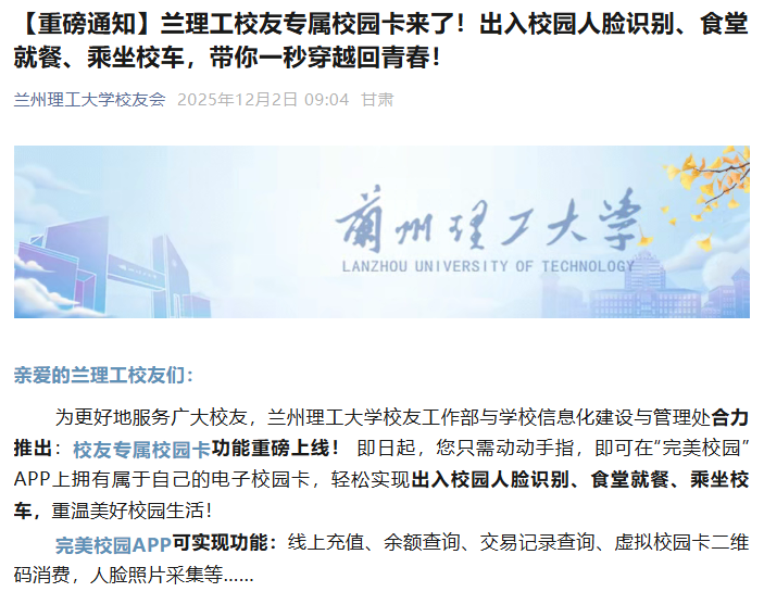 同时,为方便校友返校,现已正式打通校友身份数据与校园一卡通系统。即日起,已认证校友可通过"完美校园"APP或小程序,实现在校内食堂就餐、乘坐校车等,还可直接"刷脸"入校畅行校园,让校友能够无缝融入校园生活,重温求学时光。