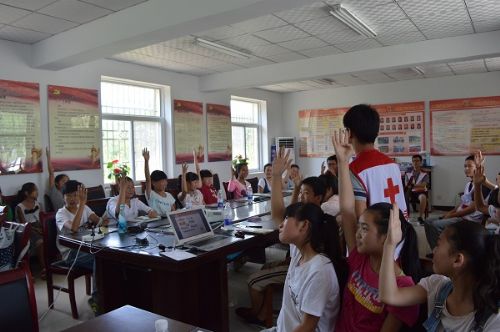 红十字志愿服务队“健康小树苗”项目服务团队员正在给村里的小学生开展网络安全教育
