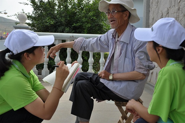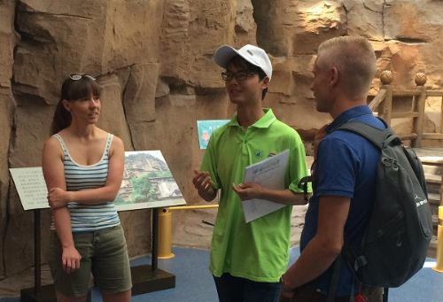 团中央“丝路新世界·青春中国梦”专项行动外语学院“甘肃省公共标语调研团”实践队员向外国游客询问对游览标语的意见和建议
