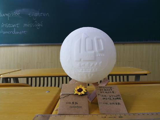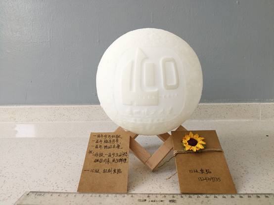 在母校百年华诞之际,袁铭校友给母校献上一款以校庆徽标为主题的月球灯,祝福母校100岁生日快乐,桃李满天下,培养栋梁,再创辉煌。